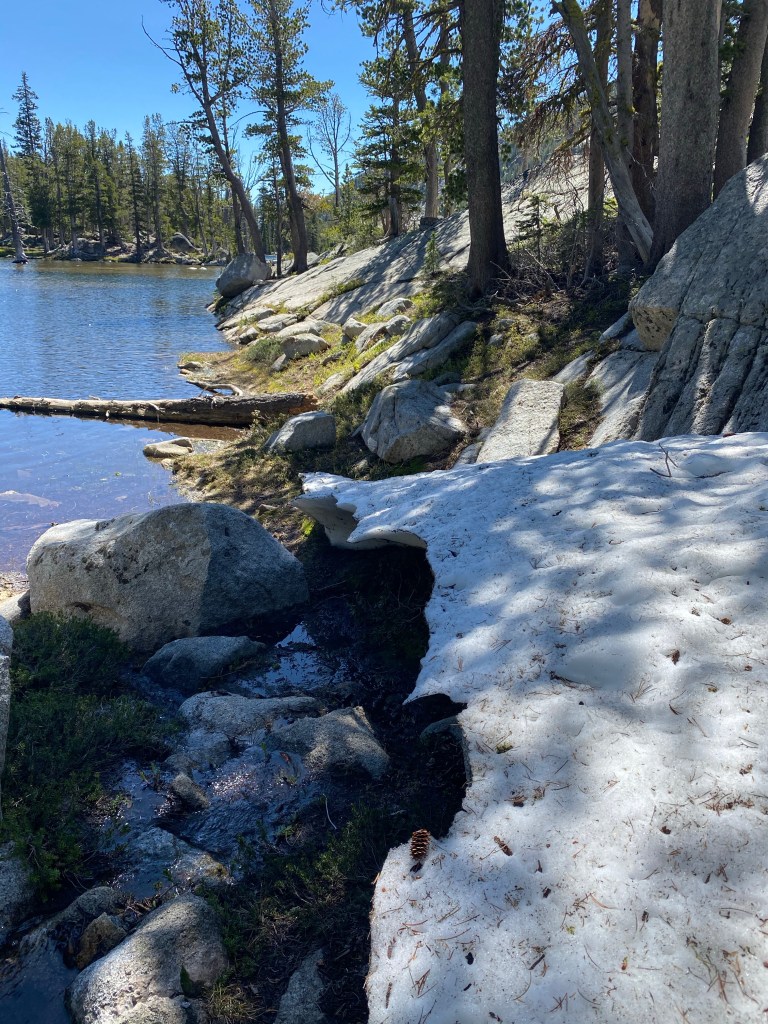 We hustled up the small ridge to the right and down the snow bank where a large hole remained from our stolen cache. Pausing at the most critical point, we will need to cross the creek into the bears territory. He was up on the ridge to the left somewhere, enjoying a tasty appetizer it wont be long before he returns. We hustled down the trail away from camp, while he watched us from the trees. We yelled “it’s okay bear” “just passing thru” “you can have your camp “all yours now buddy.” The crows were arguing above us on the ridge. My hubby reminding me how you must always listen to a crows warning.