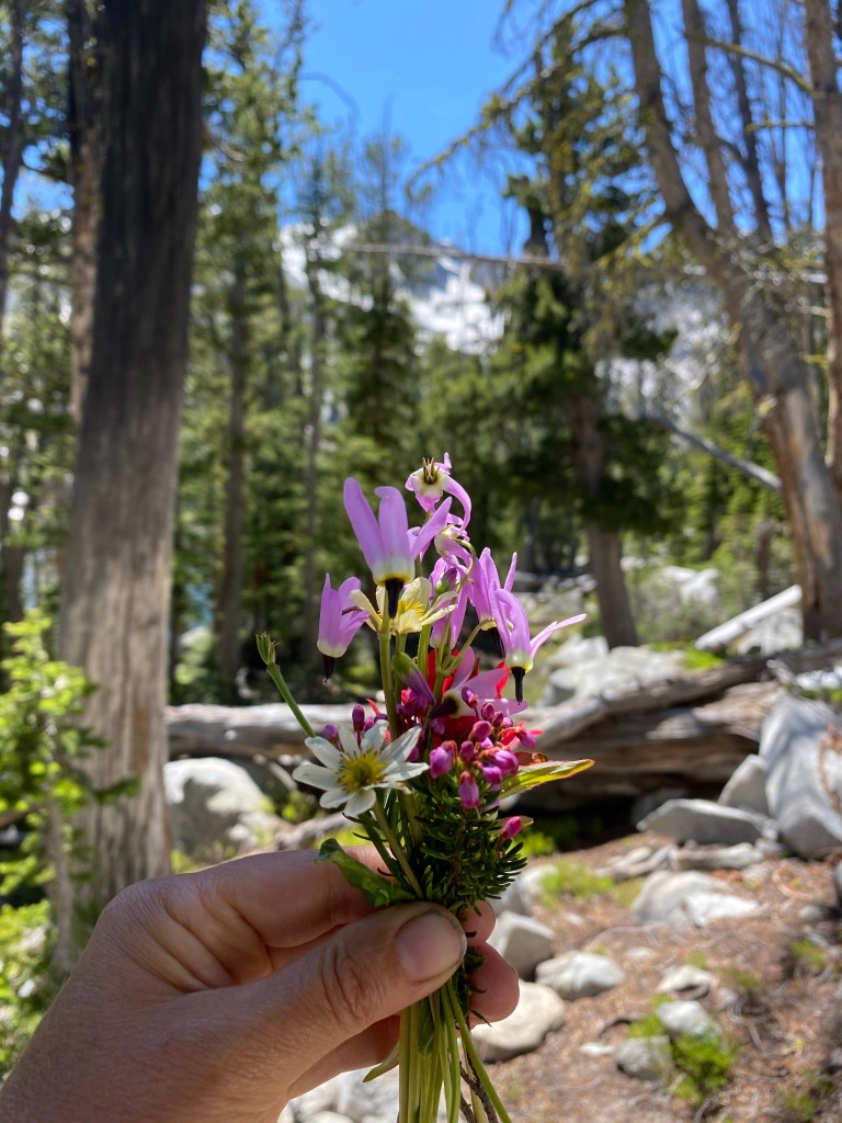The morning light brought immense beauty exactly as I remembered. The various colors of the peak glistened in the sun, as I prepared coffee over the campfire and stuffed exhausted kids with oatmeal. My hubby & daughter anxious to get down to the lake, boiling with hungry fish. We had a great morning, collecting wood, searching for big horn sheep in the high cliffs, catching cut throat trout & resting our achy bodies. An obsessed plant person, I took note of the varied wildflowers yet to bloom around our camp, wild current, carpets of huckleberries, so many colors. A fleeting thought passes..hmm if that scat was bear, there would be no sign of seeds, as it’s clearly not berry season yet. My experienced hubby consistently reassuring me in his decades coming here, has only seen black bear twice up this high. I sat on the warm rocks looking through the binoculars, taking in the beauty and spending quality time just chatting with my 16 yr old son. Looking forward to several days ahead of uninterrupted family time off the grid, immersed in the rawness of backcountry nature.