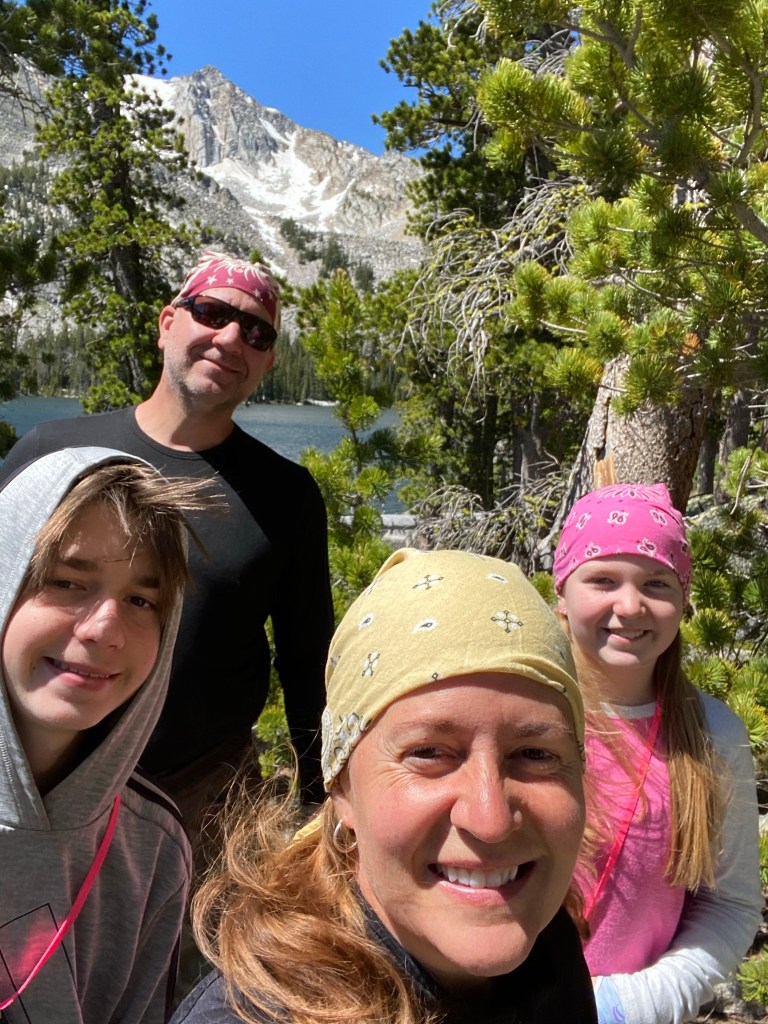 While we took turns keeping an eye on him, we worked furiously to pack up, nightfall was upon us. I asked my son for the time, it was a little past 4pm..I told our team we needed to be ready to go by 4:30 at the latest. Type A Mom, always setting goals. Backpacking out at night is a death wish. Our otherwise nonconformist teen boy stepped up big time, taking down the tent, deflating the mattresses and our overpriced gear on his own without a single complaint. While our baby girl cried uncontrollably, as she packed up her stuffies. Pleading that she could “no longer breathe”. All the while, our young chocolate lab Roxie laid in the shade asleep, tied to a tree, completely clueless. She wasn’t feeling well from her 1st ever difficult hike the day before. Perhaps it was the elevation. Whatever the reason, I was grateful for once this pup was quiet.