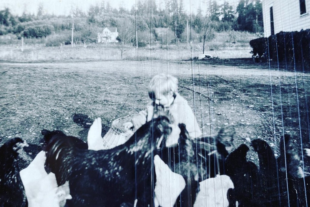 In addition to trades in carpentry, the Hansen brothers raised eggs & fryers (roosters at 100 days old) that they shipped around the region. Her Dad’s cousin, Henry Hansen, along with his wife Hazel developed their famed “Hansen Leg Horn” Chicken. Building a modestly lucrative chicken business by today’s standards. A local distribution truck would arrive twice a week, entering the rounded driveway to pick up fresh eggs. Mary & her sister Marge collecting them in metal baskets to store in the temperate room beneath the woodworking shop. No refrigeration needed. All this activity taking place where we now sit comfortably drinking coffee some 70 years later. Mary also recalls helping with the chicken harvest and tenuously plucking “All those feathers.” Explaining, “There were no gender specific roles back then.”