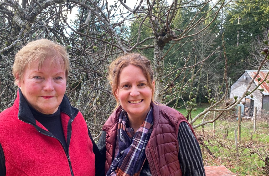 Mary & Me Winter 2020 with Fig & Grapes planted by her parents. Old livestock barn in background