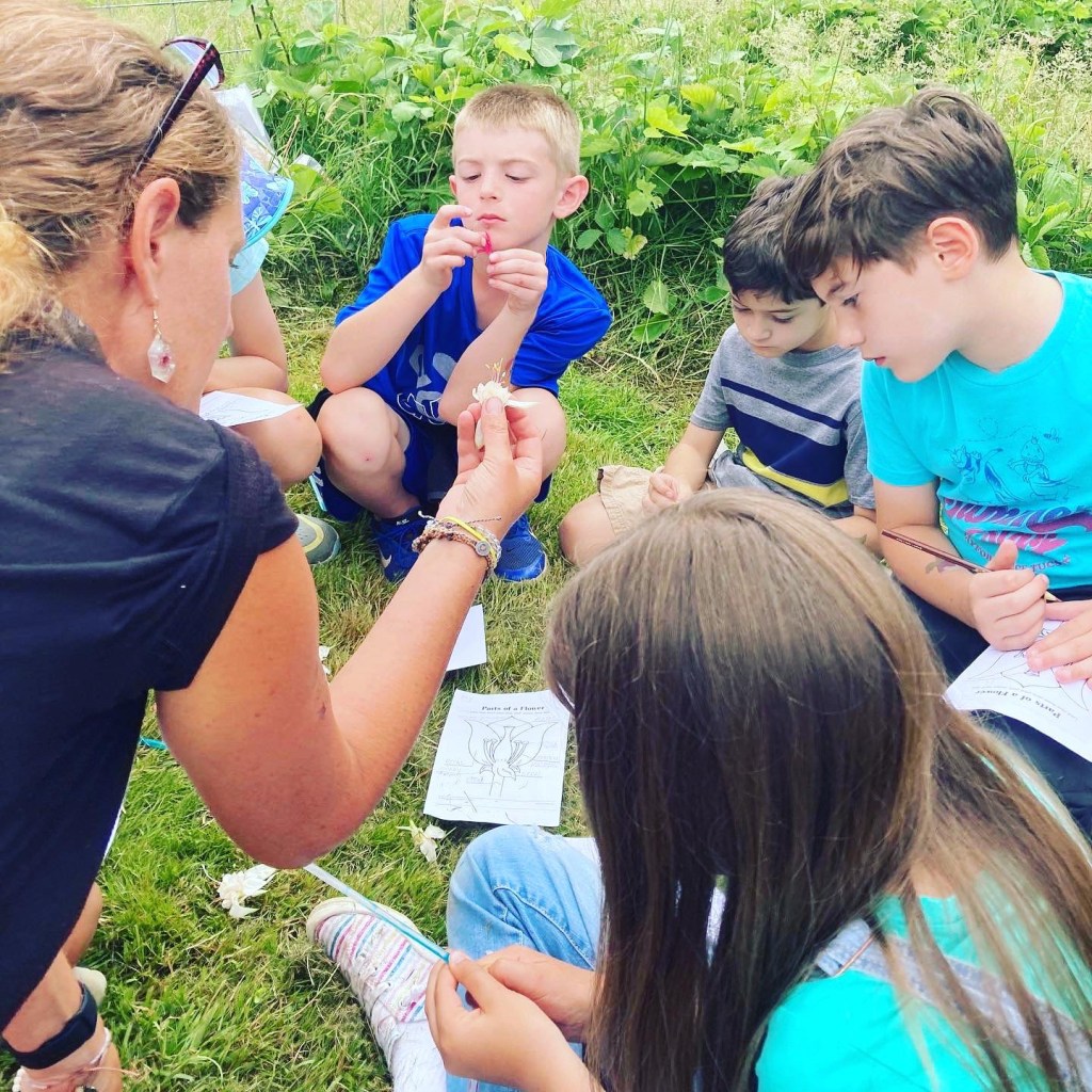 CAMP#1A: THURS JULY 1 & FRIDAY JULY 2 9am- 12:30pm 🐝 Pollinators&Flowers/Soil Biology&Veggies/Livestock&Poultry/Propagation&Fruit – During this 2 half day camp your child will learn about native pollinators, ID flower parts, soil nutrients, microbes, plant veggies, regenerative agriculture, animal husbandry, ID fruit set, taste seasonal fruits&honey, propagate fruit trees and much more!